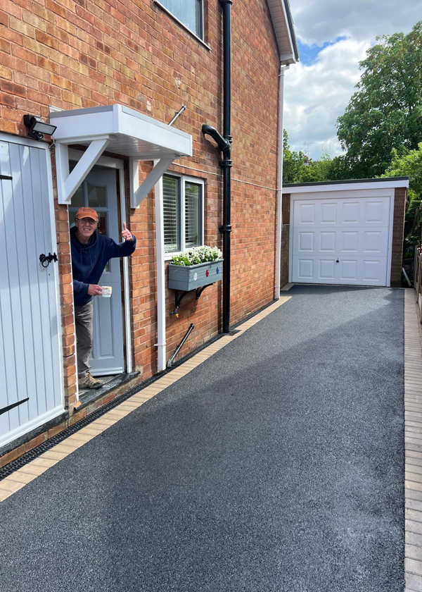 A Happy Customer with a brand new tarmacadam driveway, complete with block pave edgings and drainage.